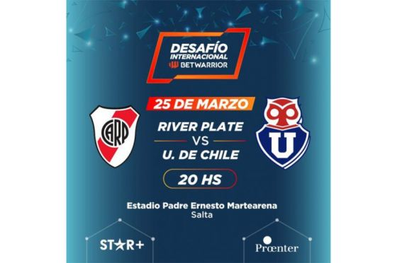 Salta será sede de un Desafío Internacional con la presencia de River Plate que disputará en el estadio Padre Martearena un encuentro con su par de Universidad de Chile. El partido está programado para el próximo sábado 25 de marzo y las entradas podrán adquirirse desde hoy a las 14 por el sistema Autoentrada: https://ventas.autoentrada.com/